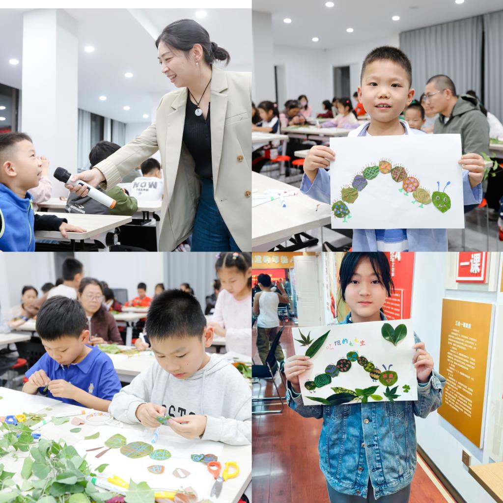 “小朋友们,下雨时的雨滴是什么形状呀?”在枣庄,视觉传达设计学院的王雪老师为孩子们带来了一堂充满童趣与创意的《点线面启蒙课:用自然的叶子创作毛毛虫》课程。她拿出不同形状的树叶,让孩子们亲手触摸感受“面”的轮廓,在轻松的互动中,抽象的点、线、面等概念瞬间变得具体可感。创作过程中,孩子们全程专注又投入,装饰环节更是脑洞大开;有的用圆点给毛毛虫“穿”上五彩花衣,有的用曲线画出灵动的波浪纹路,还有个小朋友别出心裁,把树叶贴成了“弯弯的爬行轨迹”,仿佛毛毛虫正在纸上“散步”,创意十足。课程结束时,孩子们高高举着自己的“毛毛虫”作品,兴奋地向老师和家长和“炫耀”:“你看我的毛毛虫最漂亮!”一张张笑脸,成为这场艺术课最温暖的注脚。