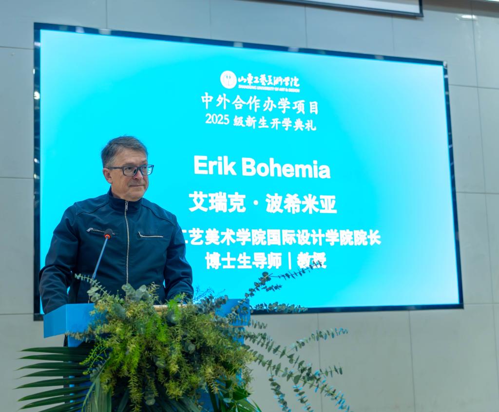 国际设计学院外聘院长艾瑞克・波西米亚教授围绕中外合作办学项目的教学理念与培养目标展开分享,他鼓励新生充分利用跨文化学习平台,主动探索多学科知识,在东西方文化碰撞中激发创意灵感,成长为兼具民族情怀与国际格局的艺术设计者。