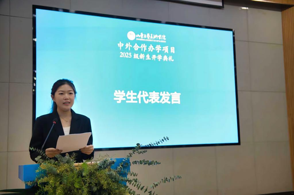 2025级工业设计(中外合作办学)专业本科生李俊仪作为新生代表发言,她表达了对大学生活的憧憬与期待,并代表全体新生承诺将珍惜这一难得的学习机遇,夯实专业基础、提升实践能力,努力成为中俄艺术设计交流的积极推动者,不辜负学校与中外导师的期望。