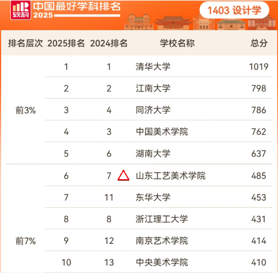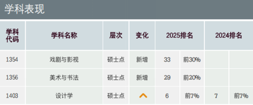近年来,学校围绕国家重大战略需求和区域经济发展,积极优化学科布局,加快推进学科交叉融合,学科建设整体水平不断提升。设计学在软科排名中稳居全国前10,2023、2024、2025年更是实现了第9、第7、第6的逐年提升,持续巩固了其在国内设计教育领域第一方阵的地位。专业学位类别首次被列入软科学科排行,学校的美术与书法、戏剧与影视分别位居全国前20%、30%。艺术学虽未进入排行榜,却也实现了由2024年第93位到2025年第87位的提升。整体看,以设计学(设计)为核心,艺术学为基础,美术与书法、戏剧与影视为支撑的学科群建设初见成效,学科生态持续优化,为学校在“十五五”期间的学科建设奠定了坚实的基础。