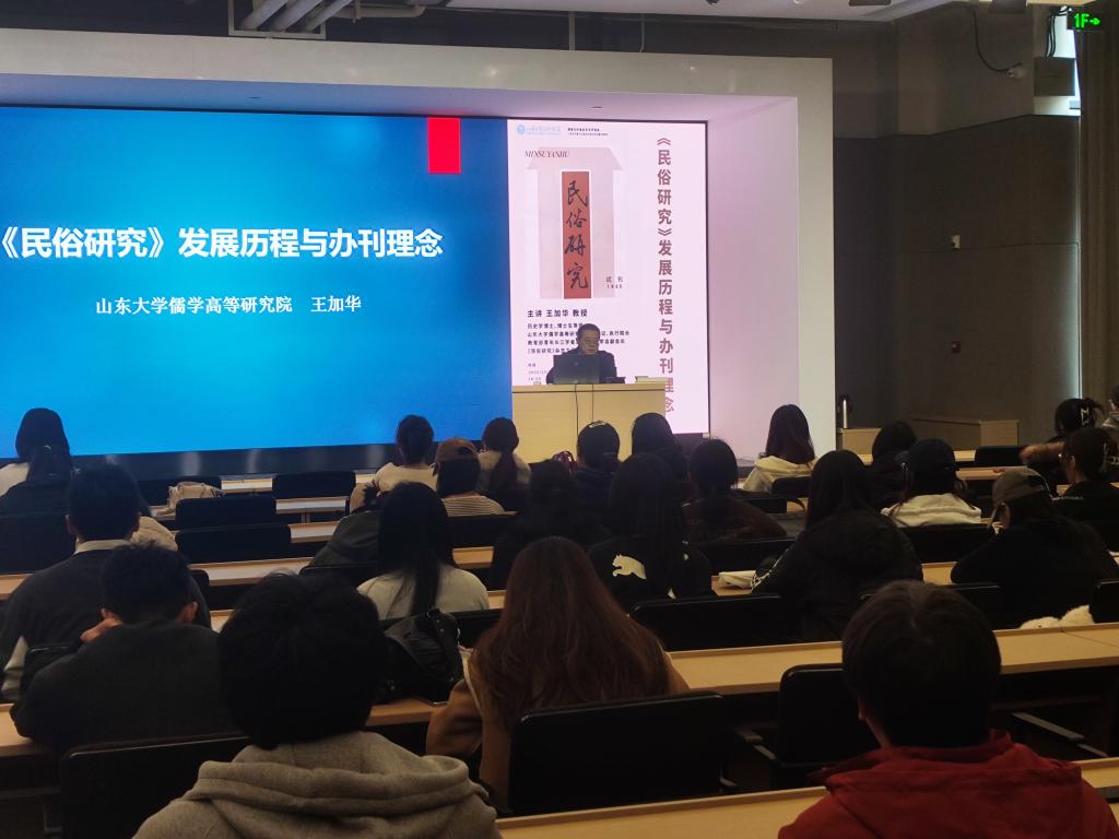 会见之后,王加华教授在博物馆报告厅作了题为《<民俗研究>发展历程与办刊理念》的学术讲座。该讲座以学科建设、理论建设的高度,从文献学、编辑出版学的角度切入,系统回顾和总结了《民俗研究》杂志的发展历程和办刊理念,从创刊过程、重要节点、办刊方针、栏目设置、刊发理念等多个侧面全面论述了学术期刊的历史进程、办刊经验和学术贡献,对我校师生的学术研究和科研发表具有重要指导意义。