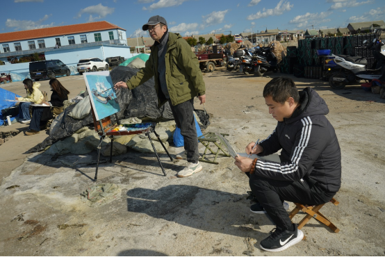 次日,团队奔赴沿海渔业城市威海,聚焦“海上粮仓”建设成效。在石岛渔港、荣成俚岛鲍鱼养殖基地等地,满载渔获的渔船陆续归港,渔民分拣渔获、冷链物流转运、工厂化养殖等场景繁忙有序。团队实地察看捕捞作业、养殖流程,详细了解海洋牧场建设、智慧渔业发展、水产品加工增值等创新实践,用画笔与镜头记录耕海牧渔的鲜活图景,挖掘渔民坚守与“海上粮仓”提质增效的丰硕成果。