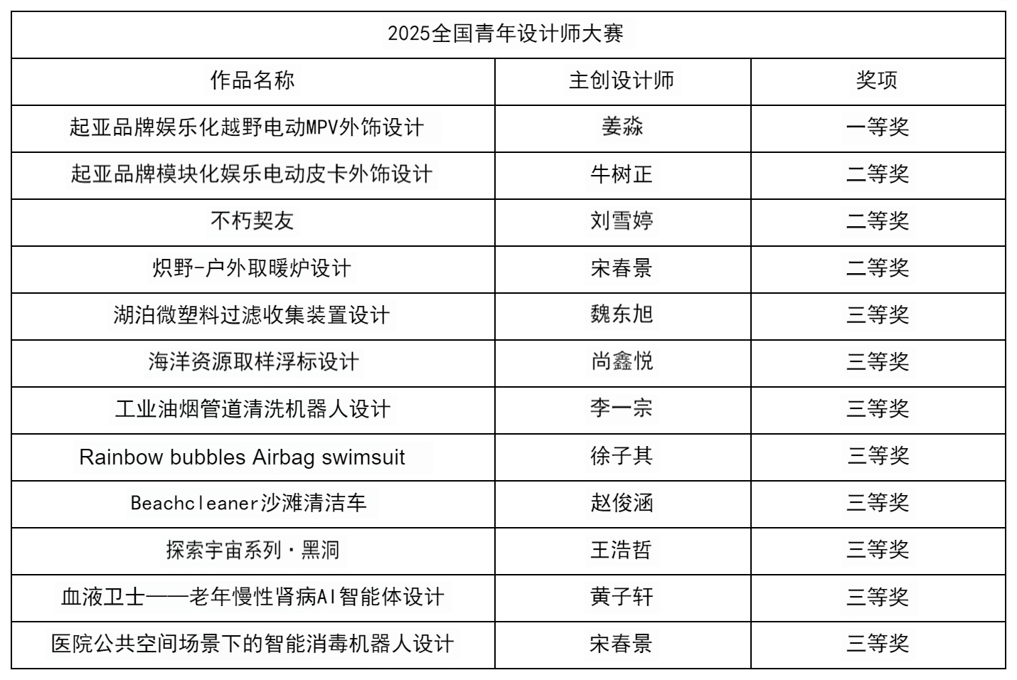 近日,2025全国青年设计师大赛获奖名单正式揭晓。我校工业设计学院学子在此项权威赛事中表现卓越,共斩获12项奖项,成果丰硕。其中,一等奖1项、二等奖3项、三等奖8项。