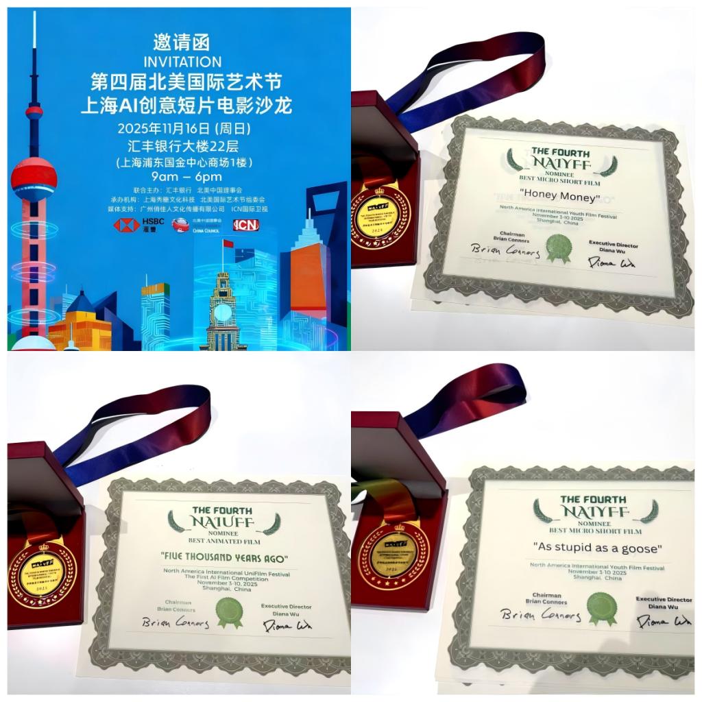 11月16日,第四届北美国际电影艺术节暨北美国际青年电影节颁奖典礼(The 4th North America International Film Festival)在上海举办。我校数字艺术与传媒学院戏剧影视美术设计专业学生的课程作品《半大脑壳》(As stupid as a goose)荣获最佳微电影编剧奖,同时微电影作品《Honey·money》、AI水墨动画作品《五千歲》(Five Thousand Years Ago)分别入围微电影短片展映单元和AI短片展映单元。