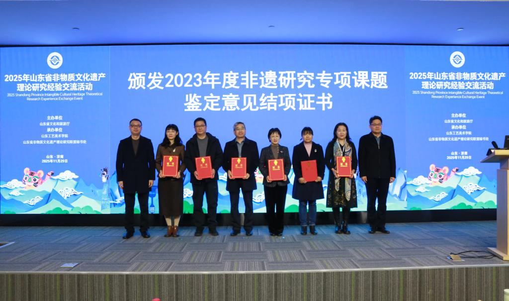 活动现场播放了2025年山东省非遗研究基地工作成果宣传片,颁发了2023年度非遗研究专项课题鉴定意见结项证书,并发布了2026年度非遗研究专项课题,公布了山东省非物质文化遗产优秀科研成果获奖名单,全面展示了全省非遗理论研究与保护传承的阶段性成效。
