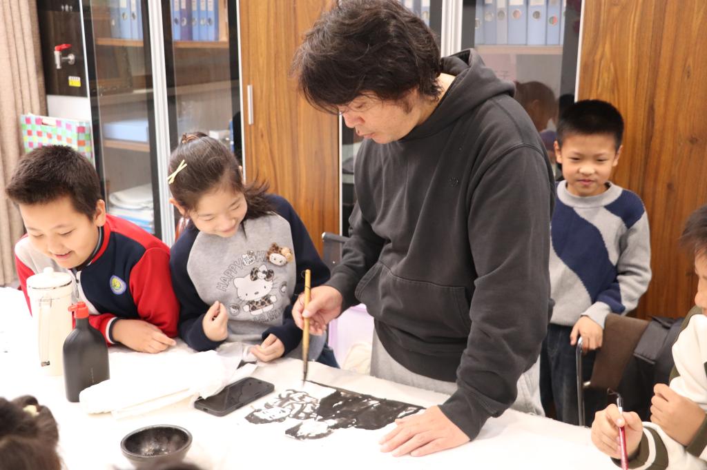日照社区墨香氤氲的教室中,造型艺术学院陈一云老师打破传统绘画教学边界,让水墨艺术变得亲切可感。他从孩子们熟悉的日常趣事切入,将校园花草、伙伴笑脸化作水墨创作的灵感源泉。铺纸、蘸墨、挥毫,老师寥寥数笔,山石苍润、枝叶疏密便跃然纸上。孩子们纷纷提笔,在宣纸上尽情挥洒创意,将生活感悟化作天真烂漫的笔墨语言。陈老师穿行其间,时而轻声点拨,时而添笔增色,师生笔下的交融互动,让美育在潜移默化中完成最生动的传递。