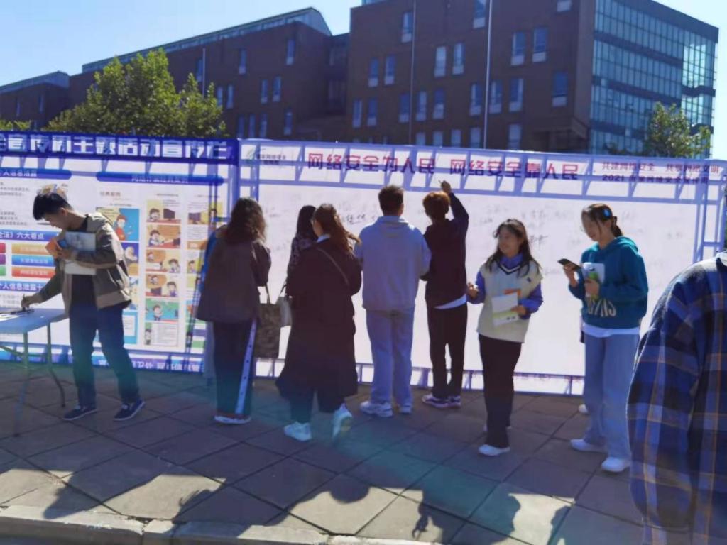 在活动现场,通过摆放网络安全知识展板,发放网络安全宣传手册,张贴大型宣传海报等形式,对师生进行《中华人民共和国网络安全法》、网络安全及防诈骗等知识的科普宣传。广大师生积极响应,踊跃参与并签名,活动得到师生的一致好评。
