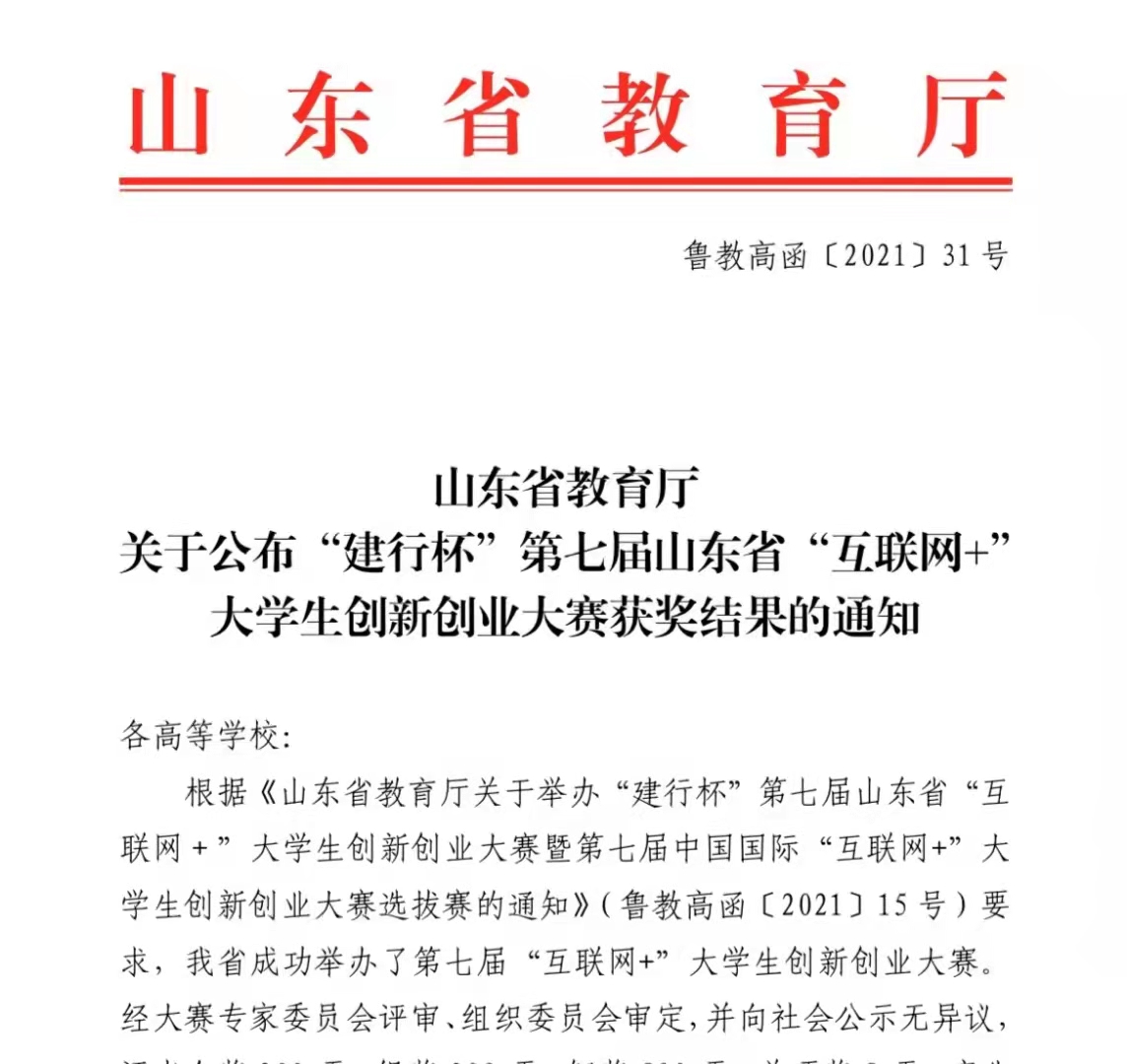 本次大赛校内赛由我校教务处、团委主办,创新创业学院承办。经校内赛选拔,《“海格童画”创想美学教育品牌》项目从50余个参赛项目中脱颖而出,并推荐至省赛。经过省赛、排位赛激烈角逐,该项目获得第七届山东省“互联网+”大学生创新创业大赛金奖。我校解恒岩、张霞两位老师荣获“建行杯”第七届山东省“互联网+”大学生创新创业大赛优秀创新创业导师荣誉称号。
