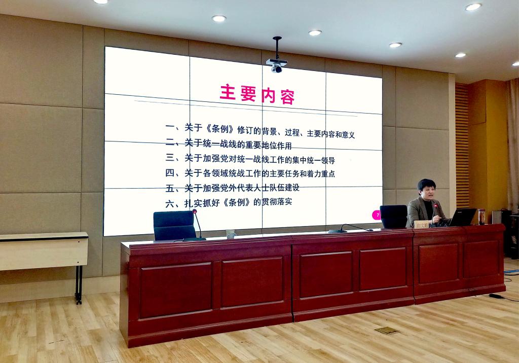 白文娟从《条例》修订的背景、过程、主要内容和意义,统一战线的重要地位作用,加强党对统一战线工作的集中统一领导,各领域统战工作的主要任务和着力点,加强党外代表人士队伍建设,扎实抓好《条例》的贯彻落实六个方面对《条例》作出了详细讲解。