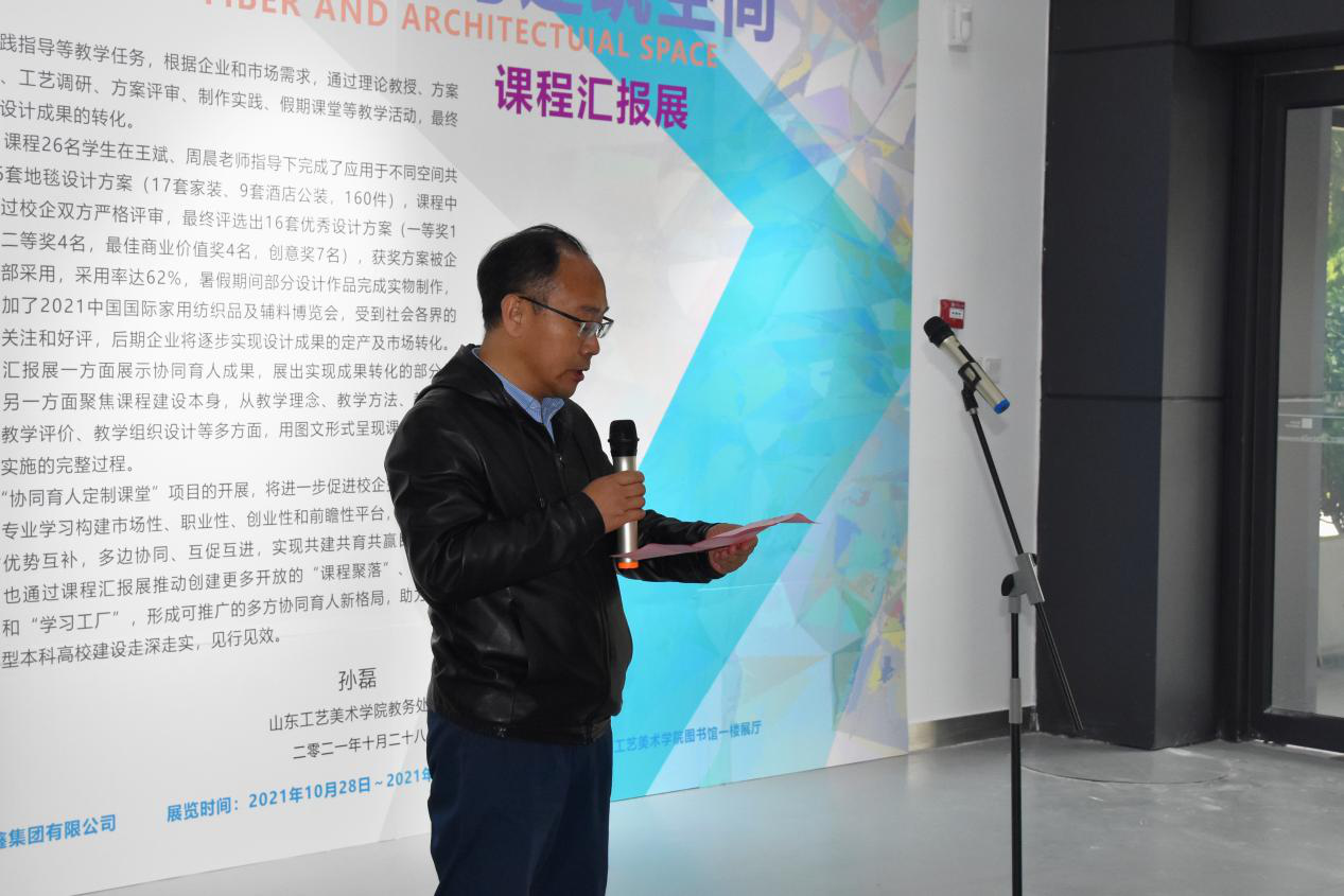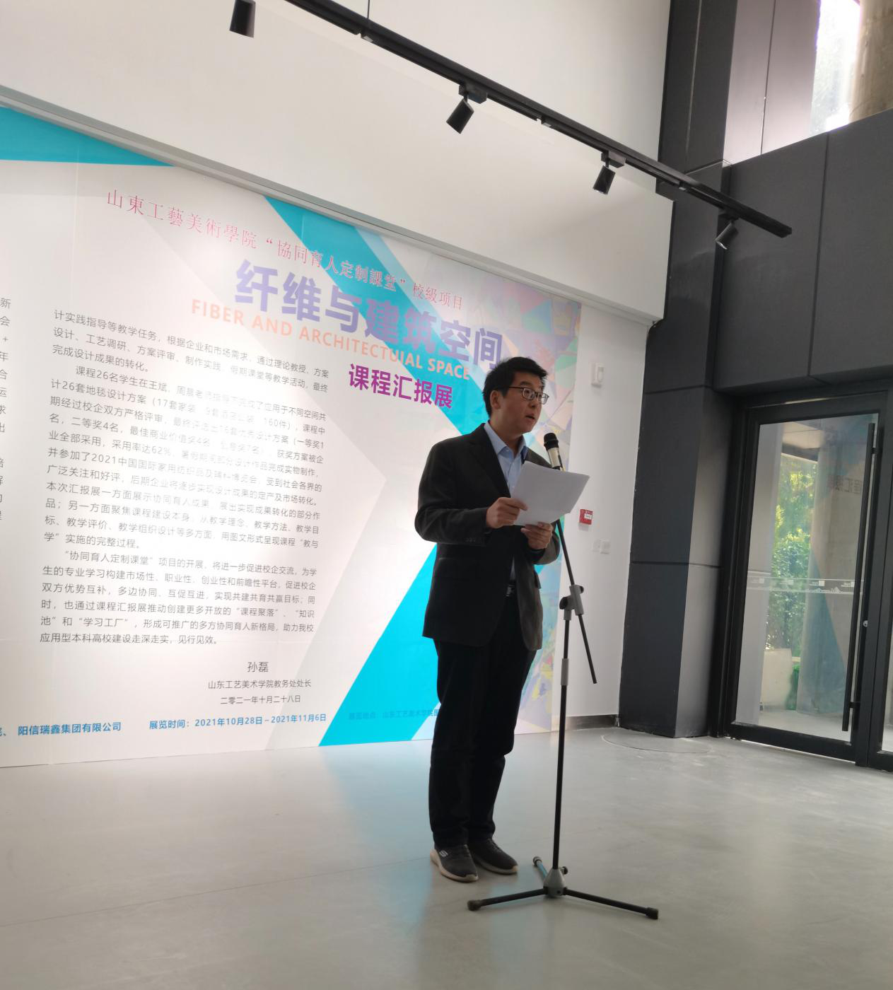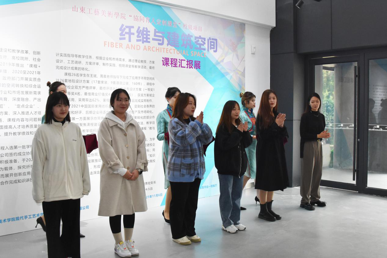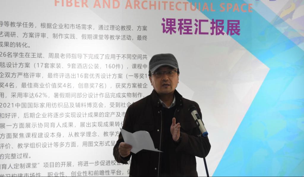 现代手工艺术学院《纤维与建筑空间》课程负责教师王斌汇报了课程成果情况。现代手工艺术学院王玲云作为获奖学生代表发言。