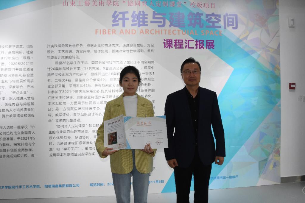 党委书记何思清,副院长董占军,教务处处长孙磊,现代手工艺术学院党总支书记金伟,瑞鑫集团有限公司董事长黄春生为获得学“协同育人定制课堂”校级项目《纤维与建筑空间》“瑞鑫之光”课程奖学金的获奖学生颁发证书。