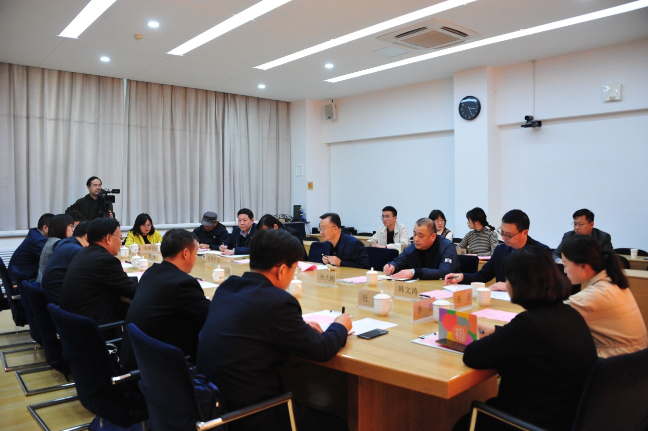 何思清从办学理念与特色、人才培养、学科建设、专业建设、社会服务等方面介绍了学校基本情况。向来宾介绍了学校思想政治教育、党史学习教育等情况,重点介绍了学校紧密结合内涵式发展要求,积极构建符合艺术院校特点的“思政+设计”双融共育机制,开展系列主题创作,将师生思想政治教育工作融入艺术创作实践的情况。