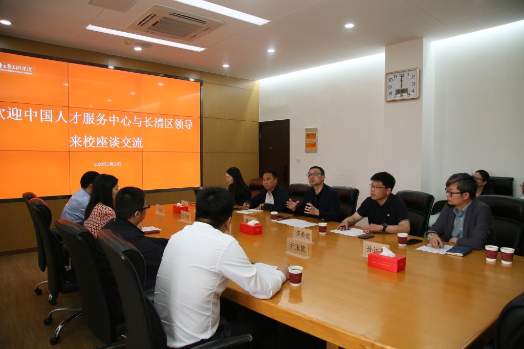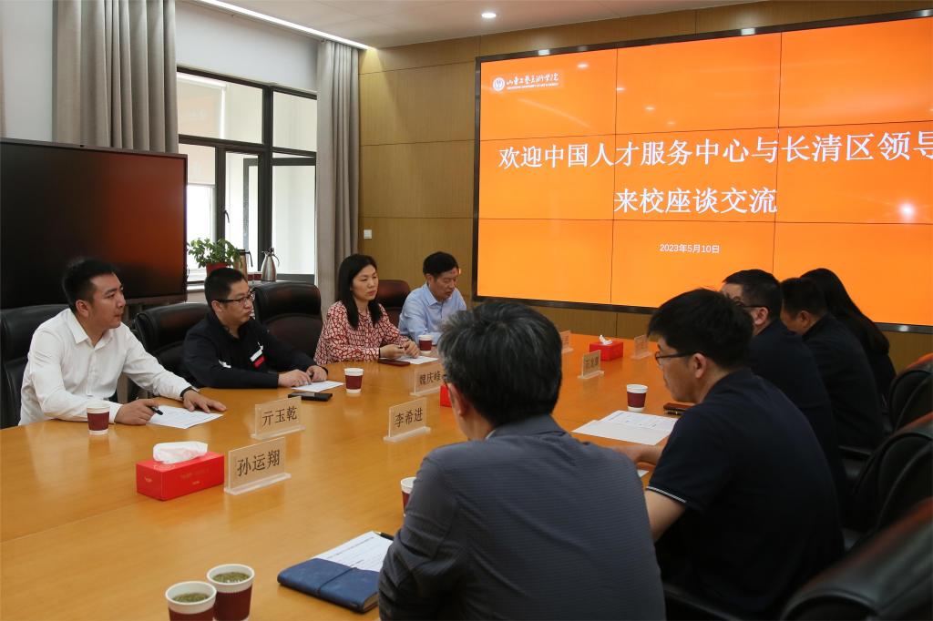5月10日上午,(国家人社部)中国人才服务中心副总经理魏庆峰、中国人才服务中心考评中心主任王泽君、新未来在线教育集团院校合作总监ESB中国区管理中心主任亓玉乾、济南长清大学城科学发展研究院执行院长冯元民一行4人来校交流。党委委员、宣传部部长、学校服务山东省文化创意产业发展管理委员会主任韩文涛出席座谈会。