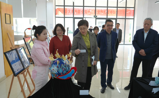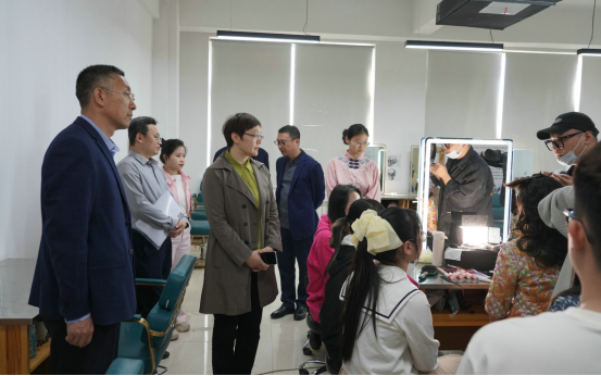 在过渡校区,王晓娟先后到图书教学楼、公共教学楼、器材设备室、专业课教室实地查看,深入了解青岛基地运行情况,观看《青岛基地学生获奖作品展》,听取相关专业教师对教学情况开展和教学成果的介绍,并进入课堂观摩妆扮设计专业《新娘造型化妆》课程。