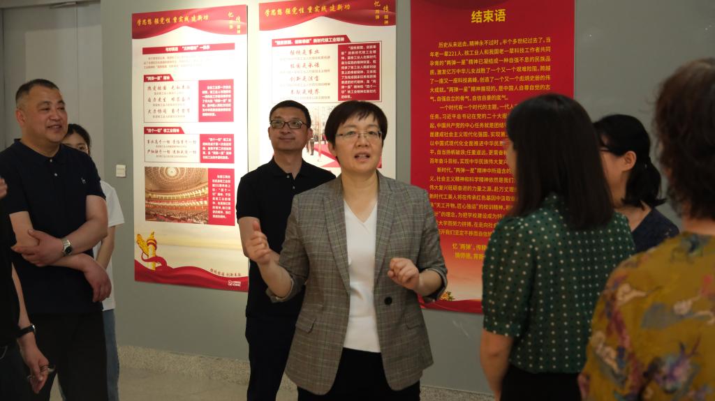 王晓娟认真观看展览内容,并听取学生志愿者的详细讲解,对本次展览给予充分肯定。王晓娟指出,“两弹一星”精神是爱国主义精神、集体主义精神、社会主义精神和科学精神的集中体现,是中国共产党人精神谱系的重要组成部分,这次展览带领我们重温我国核弹研制历史,了解核工业发展现状和取得成绩,非常有意义。学校各党总支应利用好这次展览内容,结合主题教育推进,组织师生开展参观学习、主题党日等相关活动,学习并传承好老一辈科学家胸怀祖国、服务人民的优秀品质,引导广大师生继承优良传统、赓续红色血脉、汲取信仰伟力、凝聚奋进力量,牢记时代使命,矢志爱国奋斗。
