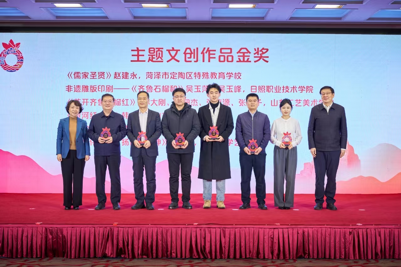 2月4日,在“花开齐鲁石榴红”山东省铸牢中华民族共同体意识成果展示活动颁奖仪式中,省委统战部副部长、省民族宗教委党组书记白山,省民族宗教委主任曹金萍,共同为主题文创金奖作品和民族团结故事竞讲一等奖作品进行颁奖,我校作品《花开齐鲁石榴红》团队作为平面设计类金奖得主受邀参加了颁奖仪式。第二届山东省“弘扬优秀传统文化 建设共有精神家园”主题文创部分优秀作品在会场进行展览,我校全面承担本次展览的策展、布展等各项工作。