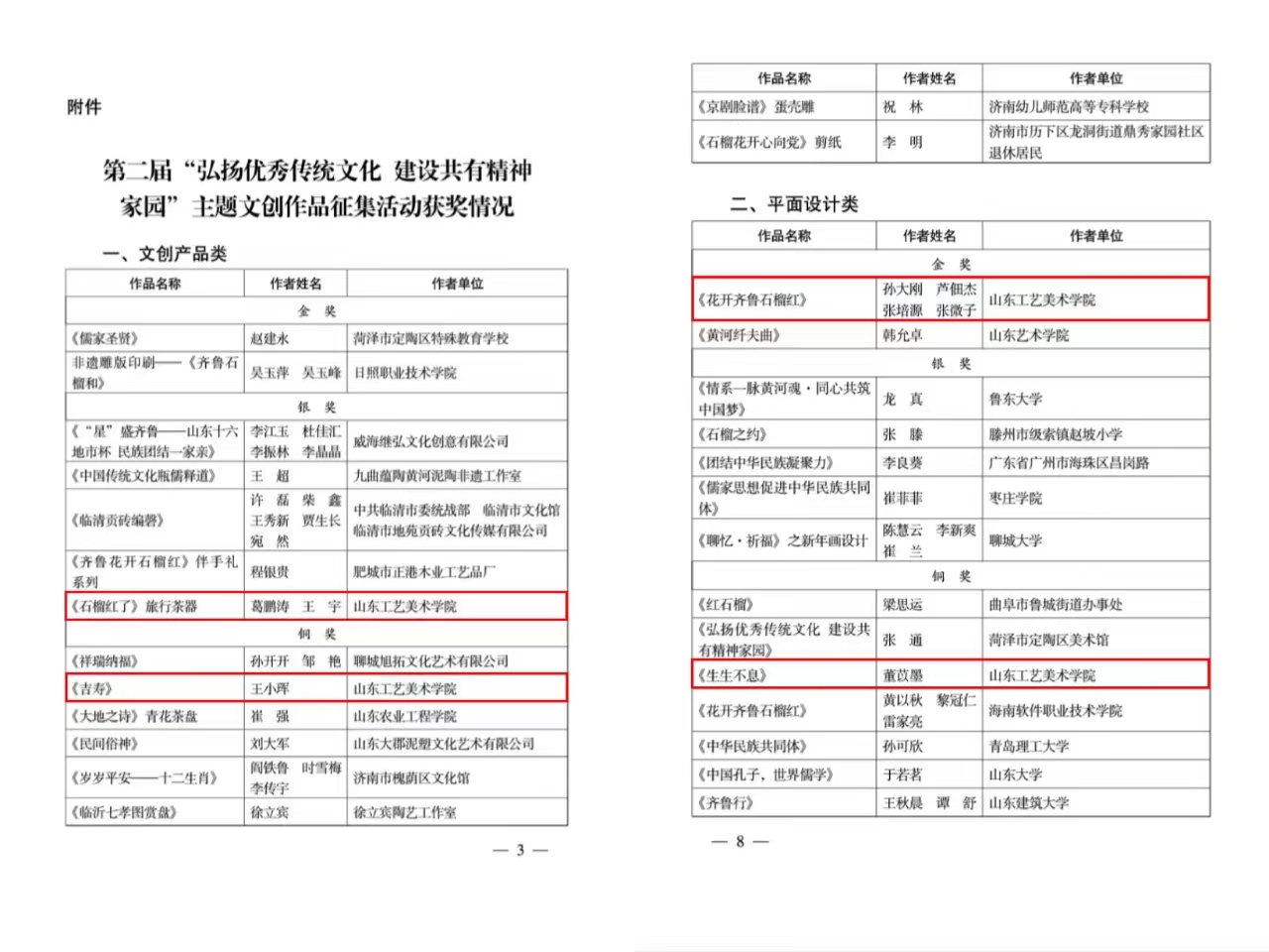 近日,中共山东省委统战部、山东省教育厅、山东省民族宗教事务委员会、山东省文化和旅游厅、山东省文学艺术联合会联合印发文件,对第二届山东省“弘扬优秀传统文化 建设共有精神家园”主题文创作品征集活动获奖情况进行通报,我校师生在活动中获得文创产品类银奖1个,铜奖2个,优秀奖3个,平面设计类金奖1个,铜奖1个,优秀奖7个,视频短片类优秀奖1个,1位教师获得优秀指导奖,学校获得优秀组织奖。