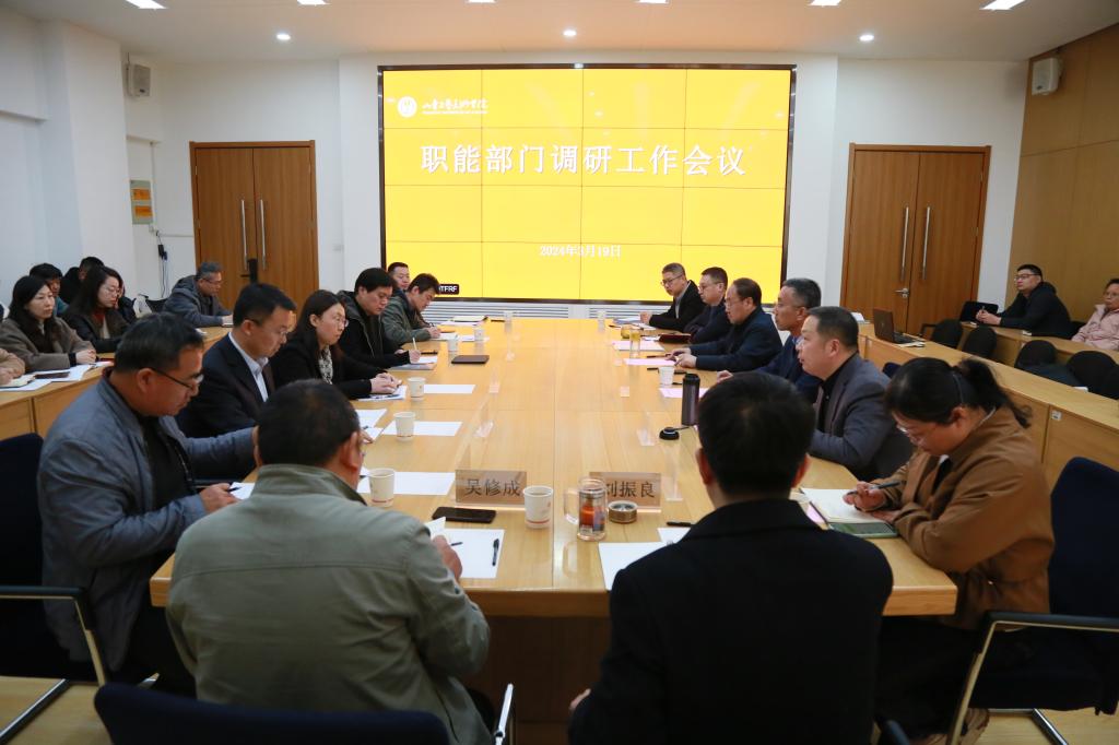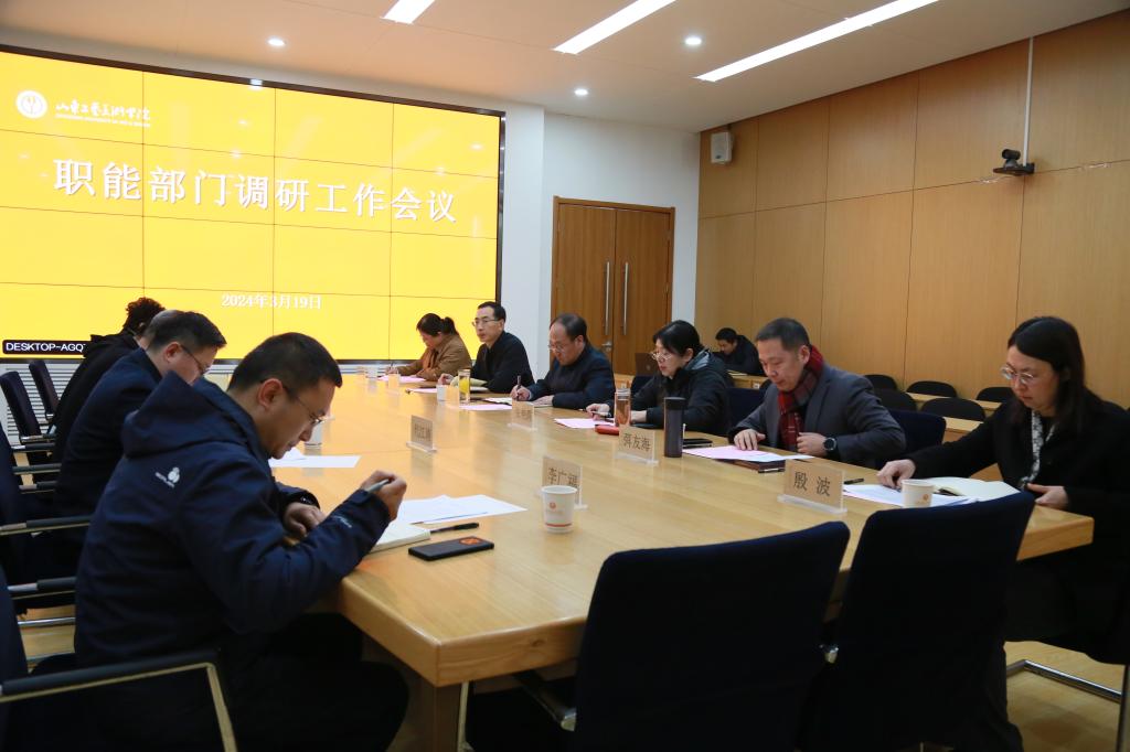 为贯彻落实学校第四次党代会精神,加快推进综合改革,着力提高内部治理效能,服务学校高质量发展,3月18日至19日,院长董占军集中调研部分职能部门工作,党委副书记韩世春,副院长张艳霞,副院长孙大刚,副院长韩文涛,党委委员、宣传部部长孙磊,党委委员、统战部部长安峰先后参加调研。