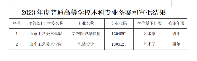 近日,教育部发布了《关于公布2023年度普通高等学校本科专业备案和审批结果的通知》(教高函〔2024〕6号),我校申报的文物保护与修复(130409T)、包装设计(130512T)两个艺术学专业获批。至此,我校本科专业增至38个,学科设置涉及艺术学、文学、工学、管理学4个学科门类、13个一级学科。