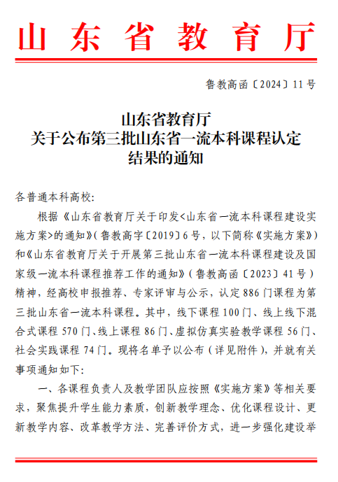 近日,山东省教育厅发布《关于公布第三批山东省一流本科课程认定结果的通知》(鲁教高函〔2024〕11 号 ),我校报送的15门课程有12门课程获评省级一流本科课程,其中线上线下混合式课程5门、社会实践课程5门、线上课程2门。至此,我校共有省级一流本科课程25门、国家级一流本科课程7门。另有7门课程被山东省教育厅推荐参评第三批国家级一流本科课程。
