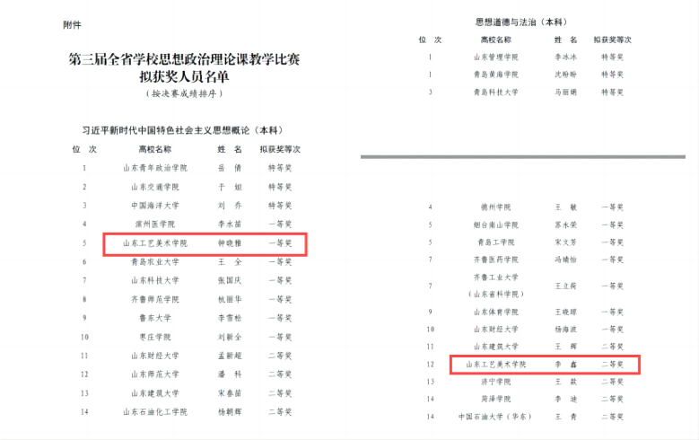 近日,山东省教育厅公布了第三届全省学校思想政治理论课教学比赛结果公示,我校马克思主义学院教师钟晓雅获“习近平新时代中国特色社会主义思想概论(本科组)”一等奖,李鑫获“思想道德与法治(本科组)”二等奖。这是我校参加此项赛事以来的最好成绩。