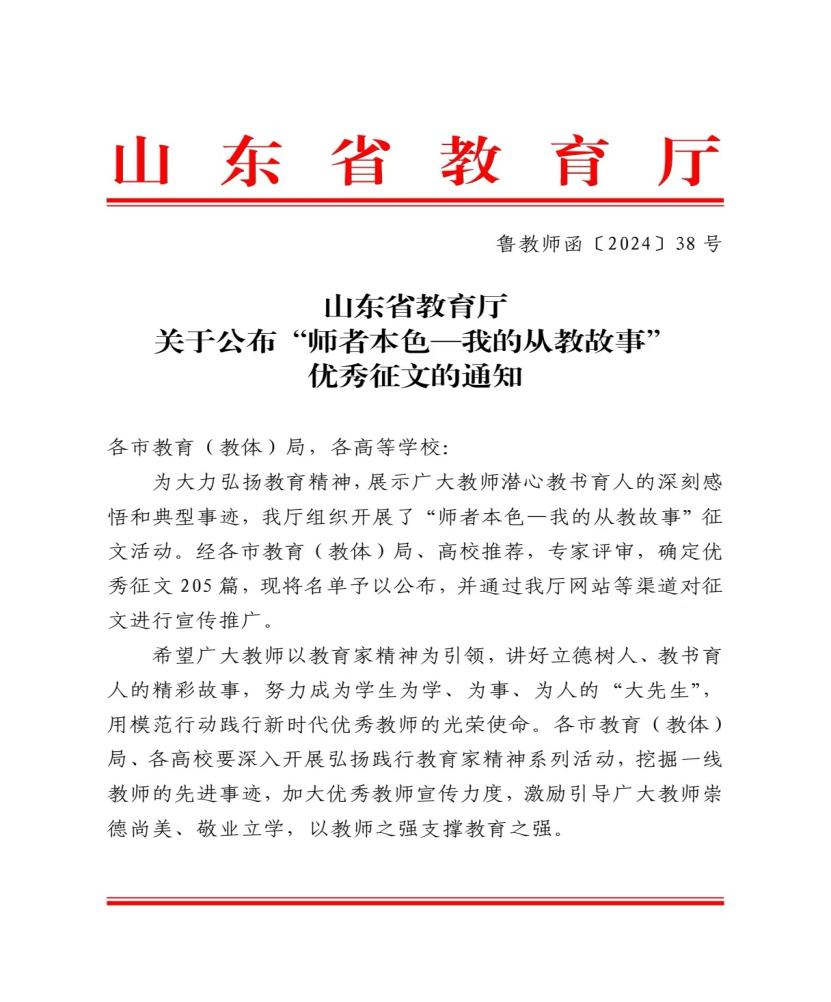 “师者本色——我的从教故事”征文活动,由山东省教育厅于2024年3月启动,旨在大力弘扬教育家精神,展现广大教师潜心教书育人的深刻感悟和典型事迹。经各市教育(教体)局、高校推荐,专家评审,共有205篇征文获评优秀征文。