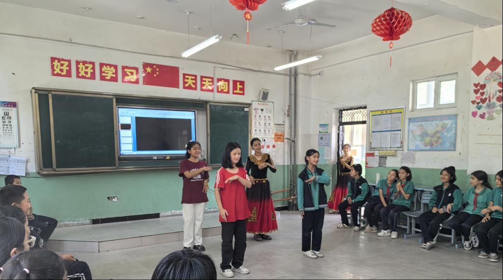 支教期间,团队师生结合喀什英吉沙县的实际情况,精心设计了四大板块的课程内容,包括宣传铸牢中华民族共同体意识,让爱国主义的种子在孩子们心中生根发芽的“心向党、齐爱国”民族团结理论政策宣讲;打破语言障碍,搭建起鲁喀文化交流交融的桥梁的国家通用语言文字课程教学;沉浸式体验感受中华五千年文明的深厚底蕴的传统文化传承和体验活动以及团队师生精心设计的心理、美育、体育和生理卫生健康知识普及课程,助力孩子们全面成长,共同为各民族间的交流交往交融,为铸牢民族共同体意识贡献青春力量!