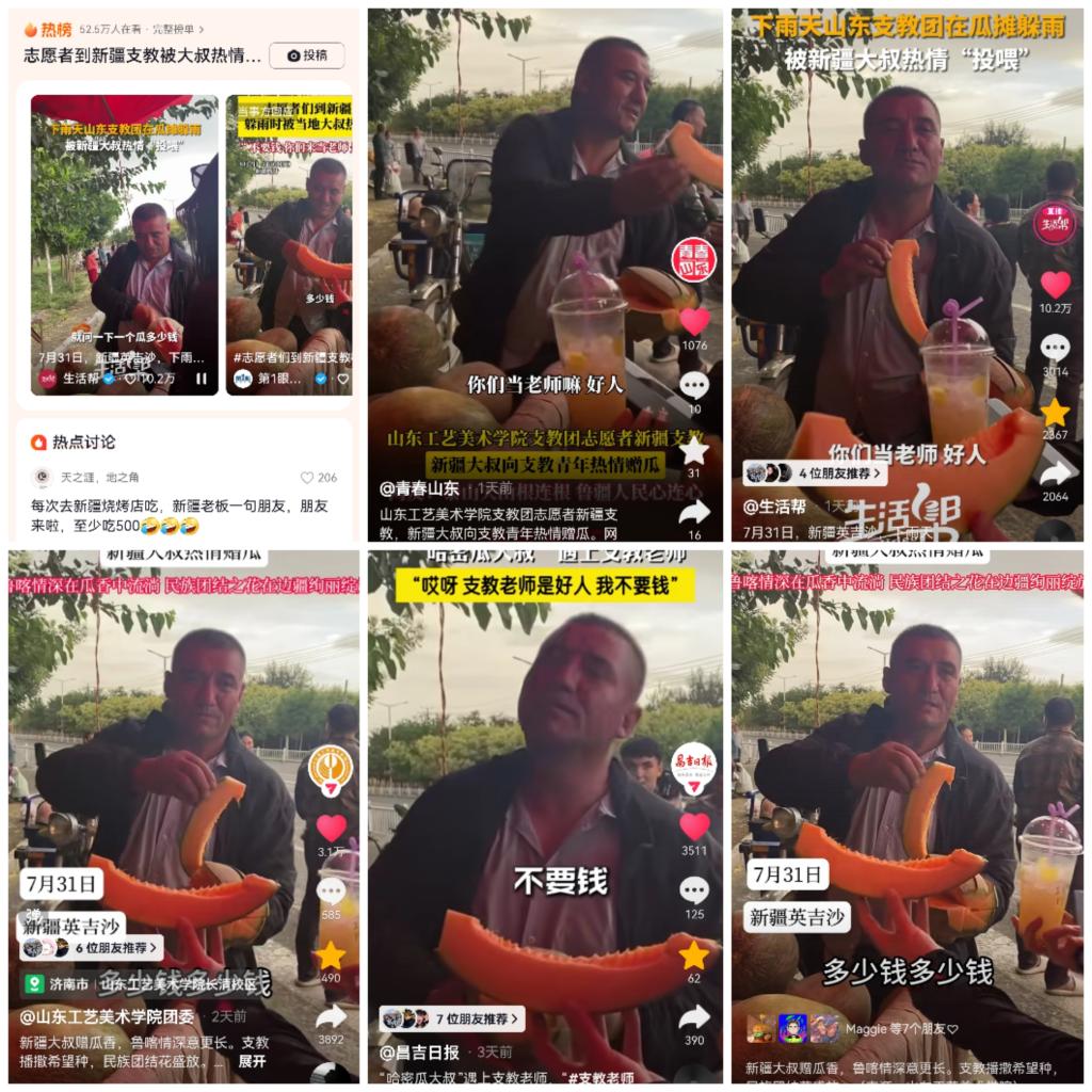 据悉,此次支教志愿服务活动中还发生了新疆大叔向志愿者赠瓜的感人事迹,他们用实际行动诠释了“新疆大叔赠瓜香,鲁喀情深意更长。支教播撒希望种,民族团结花盛放。”事迹受到社会各界和媒体的广泛关注。新华社、山东教育卫视、青春山东、新疆网、山东教育发布等数十家媒体对事件进行了报道。全网累计点赞量20余万,相关热点话题量60余万,浏览量500余万并且还在持续增长中。