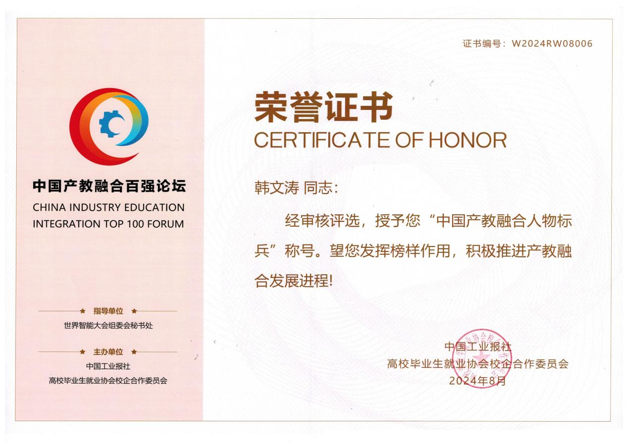 近日,由中国工业报社、全国应用型人才培养工程管理办公室、万企千校平台、高校毕业生就业协会校企合作委员会、中企国教技术培训(北京)中心联合主办的2024年度产教融合大会在山东泰安举行。历时六个月,经评审材料审核、线上投票、专家打分、现场评审等严格环节,学校最终获评中国产教融合百强院校,副院长韩文涛获“中国产教融合人物标兵”荣誉称号。