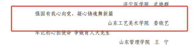 近日,山东省委教育工委公布了2024 年度全省高校“我来讲党课”“我和我的支部”获奖名单。我校数字艺术与传媒学院学生党支部书记、辅导员巩珂、孙超越、张丽丽、许凤豪主讲的《以“艺”倡廉,树清风正气,做时代新人》获评“我来讲党课”三等奖,服装学院教师党支部副书记娄晓艺主讲的《强国有我心向党,凝心铸魂舞新篇》获评“我和我的支部”三等奖。