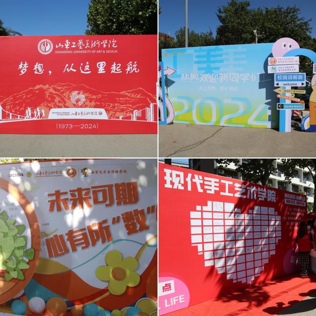 各二级学院“神仙打架”、“花式”迎新,设置一系列特色的迎新活动,用创意与热情为新生们准备了别样的“见面礼”。视觉传达设计学院采用“插旗创意”签到新模式,祝愿大家旗开得胜,开启新的天地;建筑与景观设计学院的手绘笑脸签到墙,让新生们有了一次充满仪式感的个人表达;工业设计学院用诚意满满的知识、爱意、趣味的“盲盒”为新生们开启精彩人生;服装学院精心设计的刮刮乐以及为新生准备的小礼物则像是解锁一个个神秘的宝藏,凝聚了对新生们的关怀与鼓励。造型艺术学院新旧模式融会贯通,在保留签名墙与合照传统的同时,让“时光胶囊”的年轮见证成长与梦想;现代手工艺术学院秉持“天工开物,匠心独运”的校训,向新生赠送精美独家的漆扇,以漆予你,寄期予你;数字艺术与传媒学院的“梦想之树”艺术展板、满天星盆栽,愿新生如“梦想之树”一般坚韧不拔,又如满天星般绽放属于自己的光彩;人文艺术学院用一站式迎新服务和学院定制logo的专属包包,给予新生们家的归属感;应用设计学院的“手绘校园地图”为初来乍到的学子们提供了便捷的导航;基础教学部“校史”知识快问快答活动让新生在互动中加深了对学校的了解;产教融合青岛基地为新生每人发放的印有校园标志性建筑的定制T恤,瞬间拉近了距离。各式各样的互动体验,让新生们在惊喜中感受到专业魅力的同时,在轻松愉快的氛围中,迅速融入山工艺的大家庭。