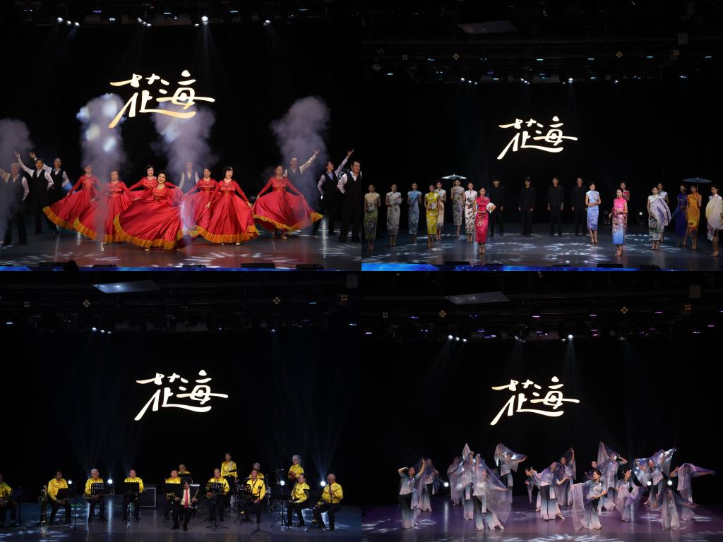 耆心映赤旗,青衿扬意气。山东老年舞协银色追梦团带来的交谊舞《生活充满阳光》,诠释着银发群体退休后拥抱文化舞台的阳光心态。由服装学院表演专业带来的走秀表演《锦裳新章学府风尚秀》借助现代设计语言传递着年轻一代对文化传承的敬畏与突破的勇气,让东方之美在时尚舞台上绽放新光彩。轻音乐团带来的器乐合奏《红歌连奏》由国家一级演员何振清作为指挥和京胡独奏者,通过《长征》《游击队之歌》《志愿军战歌》等激昂的红色旋律,弘扬革命精神,更以《迎来春色换人间》的京剧乐曲演绎革命战士的英雄风采,奏出了传统与创新的交织,奏响了经典与时尚共鸣。在2024年全省老年舞蹈大赛中荣获金奖的《泉歌》通过20位步入花甲的老年人以灵动舞姿勾勒济南泉水四季之美,表达了泉城人民对美好生活的赞美。山东老年舞蹈协会服饰团带来的服饰表演《汉服云裳》以优雅步态演绎传统文化的岁月沉淀。服装学院以舞蹈《唱支山歌给党听》展现青年传承薪火的一腔热血势不可挡。山东省著名歌唱家、国家一级演员,曾任山东省文联副主席的于联华女士带来独唱《为祖国干杯》用深情的歌声抒发老年艺术家的赤忱爱国心。