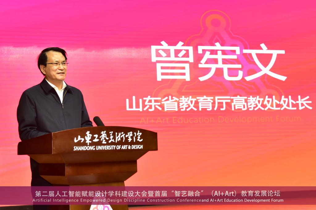 曾宪文致辞。他指出,近年来,山东省教育厅积极推进人工智能赋能教育行动,组织开展重点领域教学改革试点项目“111计划”,出台《关于推进人工智能赋能高等教育教学工作的若干措施》,不断健全人工智能人才培养体系,强化数智化教学资源建设,推动师生数字素养提升和体制机制创新。期待与会专家学者能够分享宝贵经验和前沿研究成果,深入探索“人工智能+教育”应用场景新范式,完善教育领域多模态语料库,为AI赋能设计人才培养和学科建设添上浓墨重彩的一笔。