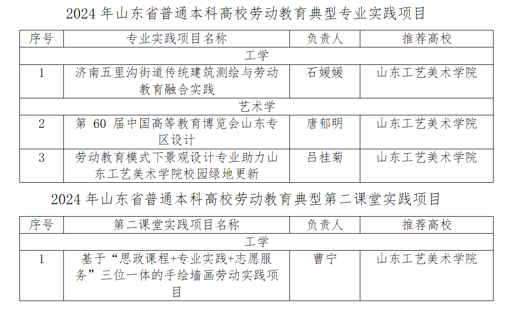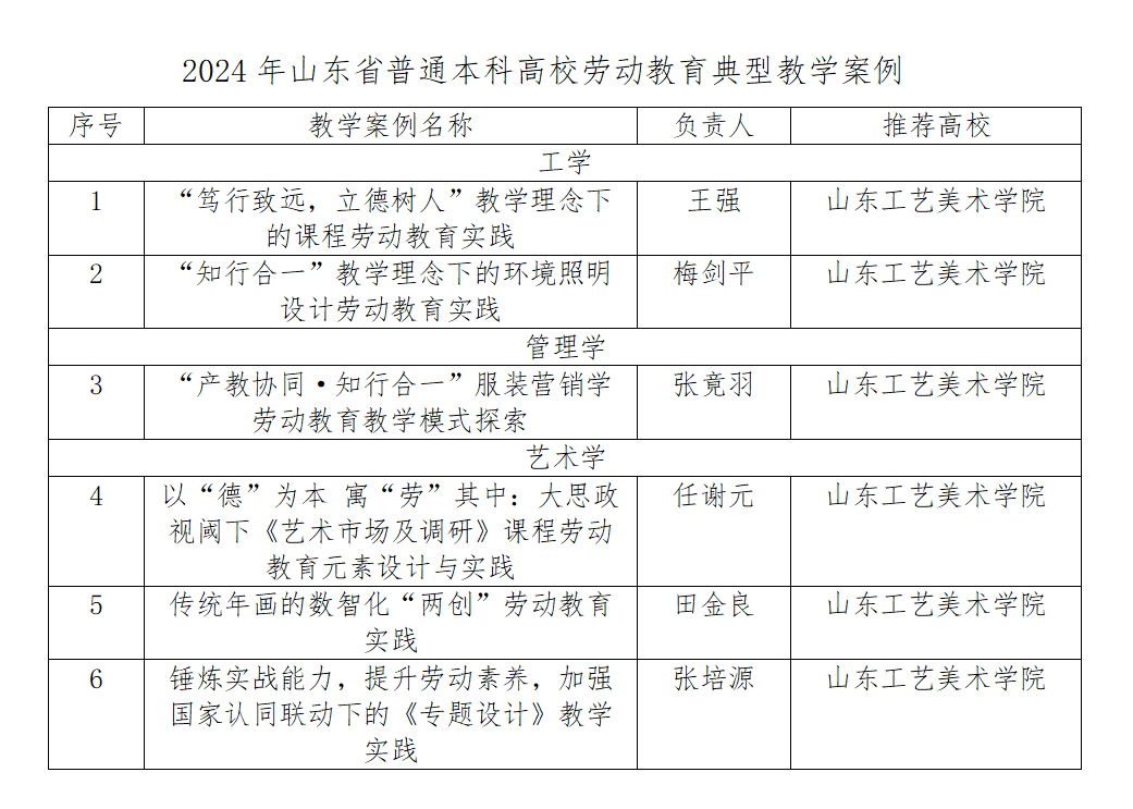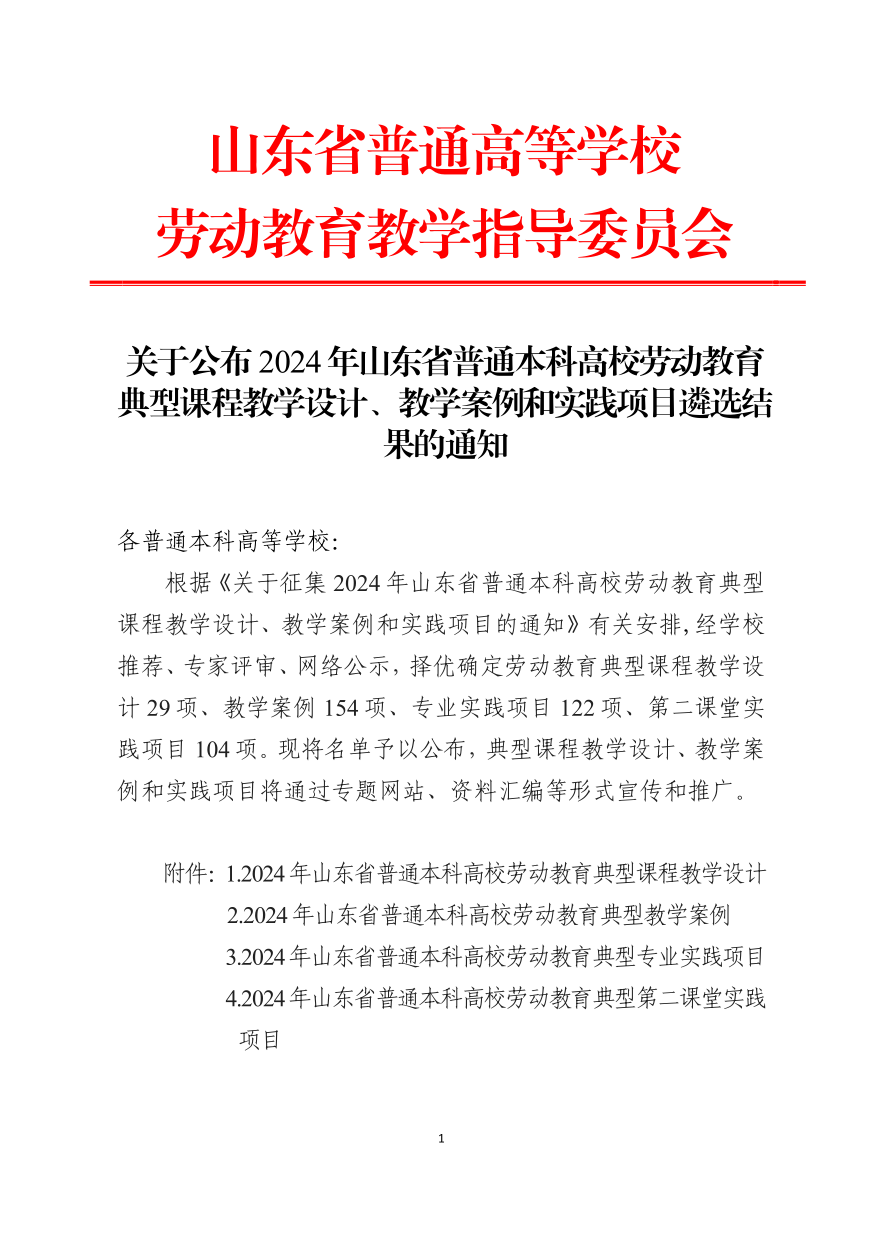 近日,山东省普通高等学校教育教学指导委员会发布《关于公布 2024 年山东省普通本科高校劳动教育典型课程教学设计、教学案例和实践项目遴选结果的通知》,我校推荐的15个项目中10个项目入选。其中典型教学案例6项、专业实践项目3项、第二课堂实践项目1项。
