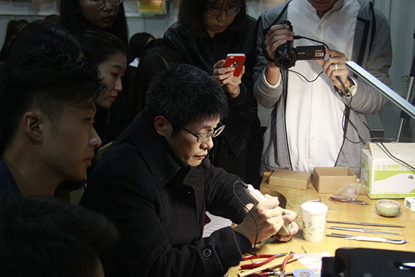 仪式结束后,陈高登以“锔月人生”为题作主题讲座,他从四个方面向大家做了讲述了自己关于锔瓷艺术的理解:一是修补文化与锔瓷艺术发展脉络的整理,主要包括锔瓷的起源、历史、发展、现状等;二是对台湾与大陆地区的锔瓷专家的深度访谈,详细介绍了几位锔瓷专家方樑生、朱方本、赖志贤以及王振海先生;三是锔瓷的艺术创作,向大家展示并解说了“音缘茶聚”、“古法今用”、“意境拾缀”、“东西韵味”等系列作品并阐述了“另类修复”这一概念;第四是锔瓷工艺的传承,讲述了系统的工法与工序的整理,还现场操作了先打眼后做钉和先做钉后大眼两种补钉方式,并详细解说了操作的细节。