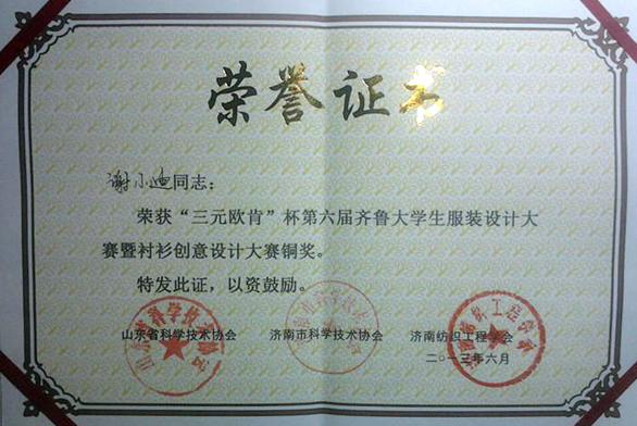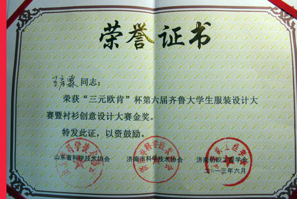6月22日,“三元欧肯杯”第六届齐鲁大学生服装设计大赛暨衬衫创意设计大赛决赛及颁奖典礼隆重举行。由邹渊老师指导的服装学院第一工作室的2010级学生王彦霖、杨越、谢小迪在大赛中分别荣获金奖、银奖、铜奖;多名学生获得优秀效果图奖。由于迎红老师指导的服装学院第六工作室2010级学生兰瑞文、房美辰在大赛中获得了优秀效果图奖,杨奕溪获得了优秀服装设计奖。