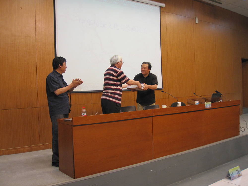 为丰富专业知识,拓展学术视野,弘扬传统文化,提高广大学生的综合素质,6月15日下午14:00,学校科研处主办、造型艺术学院承办的清华大学美术学院李燕教授的《中华传统文化与绘画漫谈》专题讲座在第一阶梯教室举行。造型艺术学院院长雷家民、党总支书记李龙潭、学校图书馆馆长赵进及工业设计学院副院长韩文涛等出了讲座。造型艺术学院等教学单位的部分师生参加了本次讲座。讲座由雷家民院长主持。 李燕教授,是当代著名的书画家,是已故国画大师李苦禅先生之子。李教授幼承家学,得父亲授,传承苦禅大师衣钵,长期致力于传统文化的继承、传播、国画创作和教学工作,成就斐然。创作上,一方面立足传统,扎根文化沃土,秉承传统文人画精髓;另一方面,在表现形式、艺术语言又有自己独特的创新。其作品往往以其强烈的艺术感染力和文化内涵使人深思。学术研究方面,在易学、金石学、宗教、民俗等传统学科都具有精深的造诣。李燕先生在从事教学和创作的同时,还担任着重要的社会职务,曾任第九、十届全国政协委员,现为齐白石艺术研究会副会长,李苦禅纪念馆副馆长,李苦禅艺术馆副馆长,中国和平统一促进会理事,中国周易学会副会长等等。多年来,致力于美术教育事业,曾发行出版了多部专业书籍。 讲座伊始,雷家民院长简要介绍了李燕教授的基本情况,对李教授到来表示热烈欢迎。李教授为丰富我校图书馆馆藏,传播专业知识,为我校捐赠了专业书籍,包括李苦禅画集精选、国内著名画家的名作及他本人的创作和理论著作,在热烈的掌声中李教授与我校图书馆馆长赵进教授完成图书交接仪式。 讲座中,李教授以文字和语言为切入点,阐述了人类文明的发展及中华传统文化的推进,通过《周易》知识及哲学理论说明了文化的重要性,并指出艺术的创作需要文化的积累和生活的沉淀,更要尊重传统文化,继承文化精髓,在继承中不断发展。李教授以自身的经历讲解了中国传统文化在曲折中前进的过程,认为学习文化知识必须要实事求是、善于发现、独立思考,深入研究。同时,李教授指出绘画的要注重美的设计,必须以人为本,充分考虑绘画的社会功能及人文内涵。李教授语言诙谐幽默,并运用肢体语言、曲艺表演等形式生动形象的表现了中国传统文化的精髓,赢得了同学们热烈的掌声。 最后,雷家民院长进行总结,认为李教授的讲座非常生动,非常精彩,对同学们丰富专业知识,拓展文化视野,深入学习、把握传统文化精髓具有重要意义。希望同学们认真学习领会,将这种指导思想扎实运用到学习和创作当中去。