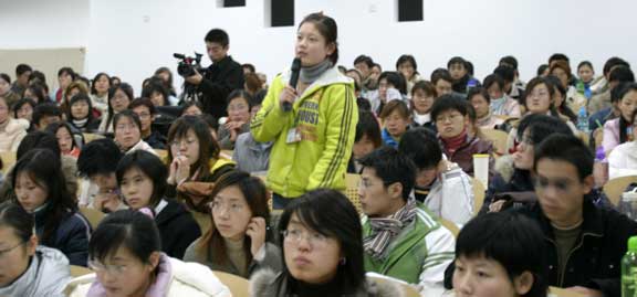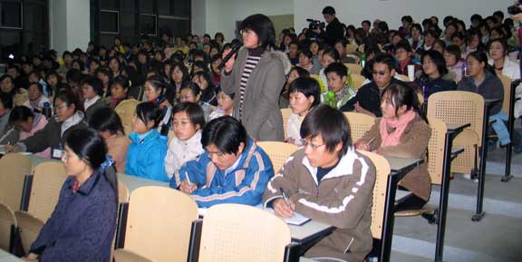 对于服装表演专业同学提出的就业等方面的问题,潘教授认为,优秀的服装模特是服装品牌的代表,是形象、气质和品位的综合体现。服装表演在中国有广阔的市场,也是一个时尚性强生命力短的职业,要想成为市场需要的先导性人才,要注意坚持形体训练,保持美的体态。同时必须不断提高艺术品位,对自身职业设计有一个准确的定位。他说,我院的专业设置与就业是挂钩的。大学是人格的塑造和自身能力、修养提升的一个重要阶段。除了要掌握过硬的专业技能外,还要注意培养自己的交流能力和敬业精神,敢于走出去与社会交流。在具体实践中要注意与市场的对接,关注服装行业的发展,了解服装行业的前景和状况,利用社会资源补充自己的不足。在继续考研深造还是直接进入社会这个问题上,潘院长希望同学们根据自身条件和能力作出正确的选择,既不能好高骛远,又不能自暴自弃,要始终坚持基础学科的学习和实践能力的提高。