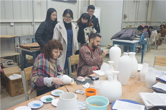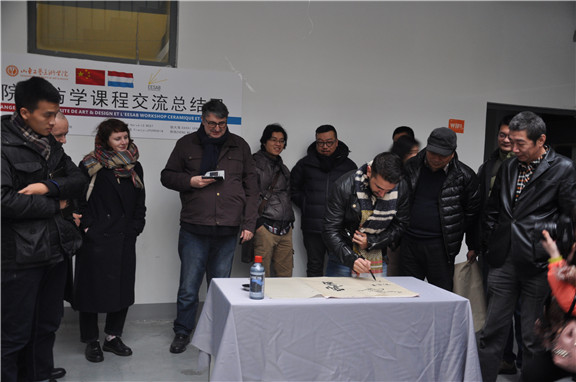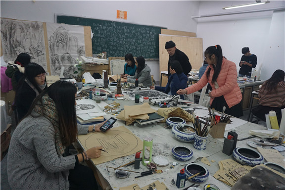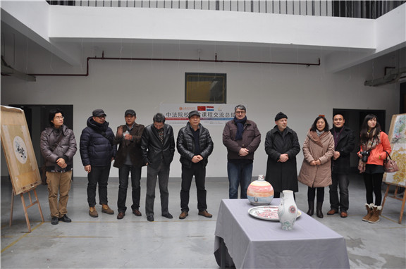 2015年11月16日至26日,法国布列塔尼欧洲高等美术学院(EESAB)师生一行6人来我校进行了为期十天的访学交流。他们根据专业的不同,师生分为两组,与我校现代手工艺术学院和造型艺术学院的师生开展了陶瓷和中国书画专业的课程合作交流与学习。 课程合作项目开始前,现代手工艺术学院陶瓷教研室耿大海、余杰星和郑伟老师带领法国师生参观了我校美术馆、博物馆和艺术实践教学中心,观摩了现代手工艺术学院陶瓷班、工作室和造型艺术学院中国书画班的课堂授课。让他们先了解我校的教学场所、教学设施等基本情况以及陶瓷专业、中国书画专业的授课方式。在此基础上双方师生又进行了进一步的交流,法国师生介绍了EESAB的地理位置和发展历史,以及他们学院各专业的分布和安排,并详细介绍了EESAB的陶瓷专业和绘画专业,展示了他们的部分学生作品。 陶瓷专业课程合作,由法方的海赫威老师指导现代手工艺术学院陶瓷班 和法国学生画出一些有关瓷器图案的设计图,从中选出四件,由中方学生代表与法方学生一起将选中的设计图手绘在烧制好的瓷器上来完成作品。期间,海赫威老师不断对同学们的创作进行点评和指导,给出了很多修改建议。他注重引导和激发学生的想象力和创造力,认为学生自己的“idea”最重要,将西式教学理念贯穿了整个授课过程。 绘画专业课程合作,由法方弗朗西瓦老师在造型艺术学院谢其云老师指导的中国书画班进行。他给书画班同学们讲授了西方绘画史课程,让同学们根据他所展示的古代中国地图,利用其中的各类元素,结合中西方绘画特点与画法,创作完成以“地图”为名称的作品,并要求进行文字联想,在作品中充分利用中国的水墨元素。弗朗西瓦老师指导学生作画强调整体效果,注重画面层次感,对细节的把握也丝毫不马虎,画作留白的处理,甚至一个线条、一个墨点的增减都反复斟酌、端详。他注重培养学生思考问题的方式甚过注重教给学生创作技法。在他细致入微、不厌其烦的指导修改中,同学们均感受益匪浅。 课程合作结束后,举办了两校访学课程交流总结展。同学们的作品以水墨画、艺术装置、手绘陶瓷等形式进行展出。参与课程合作的双方师生对此次课程合作取得的成果感到满意。大家认为对于同一个题材的作品创作,中法学生有着不同的思维方式,不论是中国学生还是法国学生,一定要打破直线性思维,要把自己的思维、眼界放宽,这样创作出来的作品才更成熟更新颖。法方老师表示,有一些作品让他们感到不可思议,中国学生们的绘画功底和悟性令他们啧啧称赞。中国学生表示法国学生独立思考和创新的能力值得他们借鉴和学习。 这次两校课程合作与交流,不仅让中法学生在创作过程中彼此学到许多,更重要的是加深了两校师生的友谊。