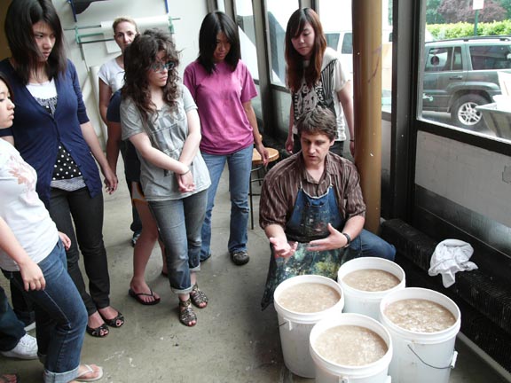 6月16日,2025新澳门免费原料大全赴美国俄勒冈大学学术交流代表团进入在俄勒冈大学课程教学交流的第二天,上午我校13名同学在俄勒冈大学学生带领下参观了俄勒冈大学校园,并进行了课题探讨,在指导老师的帮助下,确定课题。下午同学们购买了创作材料,开始了课题创作。在创作过程中,两校的指导教师进行了针对性指导。谭颖教授、王传东教授、赵进教授也到课堂与同学交流,询问学生课题的选定情况及课题创作思路,并及时向学生指出创作的注意事项与创作方向。在集体交流、辅导后,由俄勒冈大学建筑与艺术学院Craig 教授,给两校学生上了一堂摄影课,Craig教授先进的摄影理念,多种多样的摄影手法与技术,拍摄的照片极富震撼力与想象力。Craig 教授同时还是一位数字技术电脑编程专家,在数字技术及艺术创作方面造诣深厚,其编写的软件多次在美国软件领域获奖,比尔•盖茨曾为其颁奖。