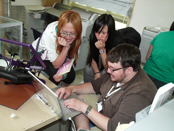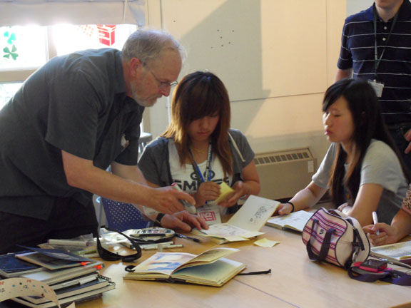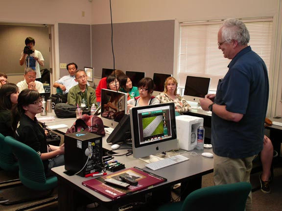 下午,俄勒冈大学建筑与艺术学院数字美术系前系主任Ken O`Connell教授,给两校交流学生上了第一堂课。Ken O`Connell教授是动画专业的资深教授,曾担任奥斯卡动画影片评审,是美国动画界的较有影响的专家。Ken O`Connell教授介绍了本人的艺术经历,并带来自己十几年来积累的艺术作品与设计笔记,与同学分享自己的创作过程。Ken O`Connell给同学布置了为两校交流精心设计创作课题,让同学现场创作,并亲自给同学们示范,以启发同学们的创作灵感。Ken O`Connell教授要求各位同学以“树”为题创作三幅作品,并且对三幅分别提出了不同要求。在同学们完成作品后,Ken O`Connell教授与所有同学相互观摩作品,并进行了探讨。