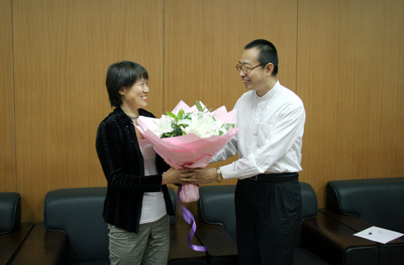 院长说,今天是中国的教师节,借此机会我向老师谭莹女士献束鲜花,表达我的敬意。