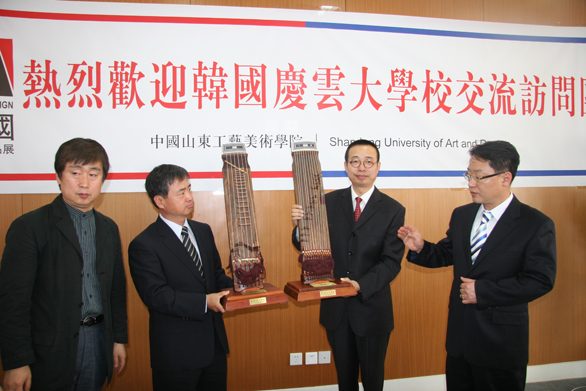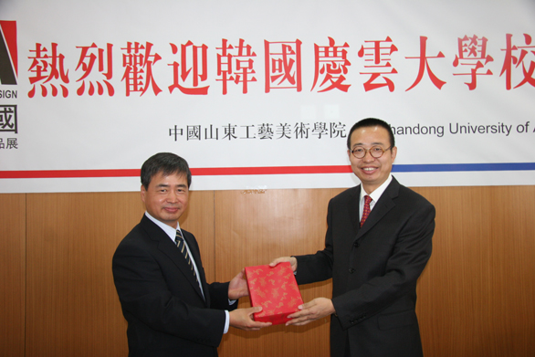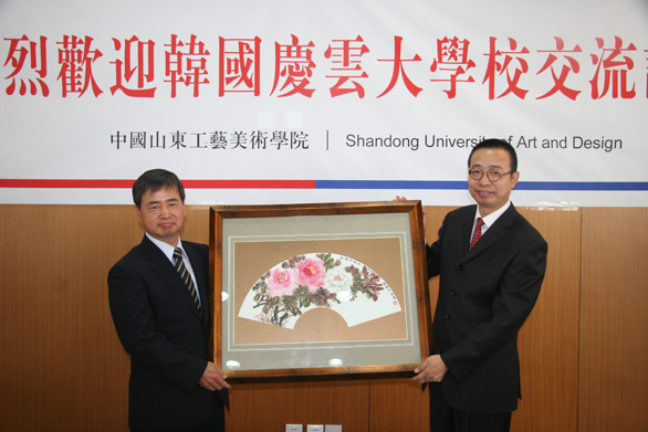 副院长李新代表学校与庆云大学副校长张周锡互换了纪念牌;数字艺术与传媒学院院长王传东代表数字艺术与传媒学院与庆云大学视觉影像教学部部长金基根互换了纪念牌;视觉传达设计学院院长石增全代表视觉传达设计学院与庆云大学影视部副部长池龙善互换了纪念牌;视觉传达设计学院学生代表、数字艺术与传媒学院学生代表分别与庆云大学学生代表互换了礼物。