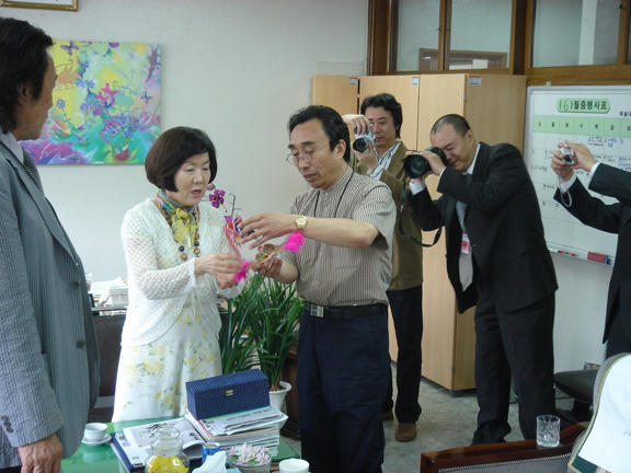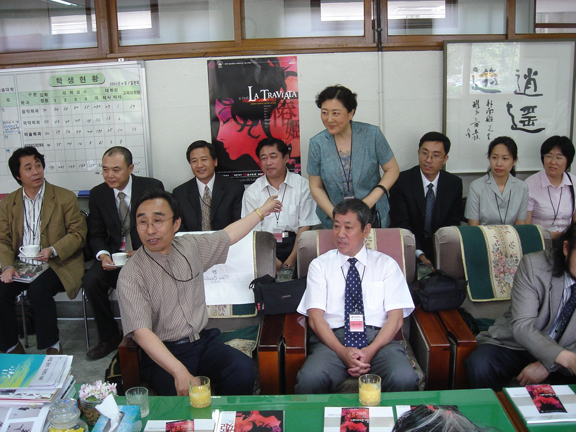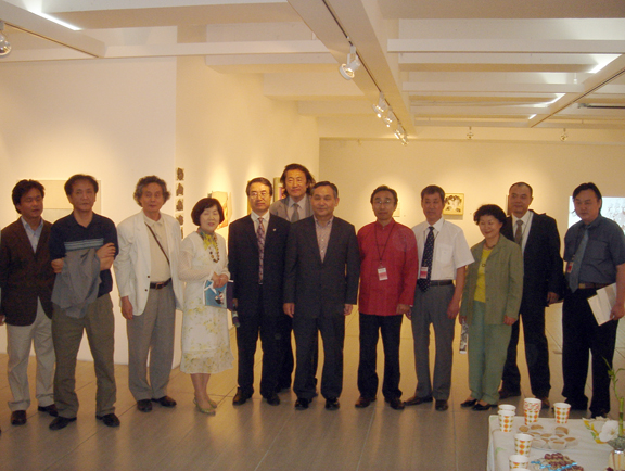 六月九日九时,画展布展工作已经准备就绪。按照预定计划,我校代表团一行与庆北大学校长朴南姬、美术学科学科长卞遗福、美术学科教授卢泰范等人亲切会见。朴南姬校长与陈飞林院长分别介绍了两院校的基本情况。双方表达了长期交流合作的愿望并互赠礼品。