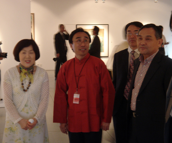 十一时,“韩中大学交流展”在庆北艺术大学美术馆隆重开幕。庆北大学金达雄校长、庆北艺术大学朴南姬校长、卞遗福学科长以及我院教务委员张洪军处长、造型艺术学院陈飞林院长、
