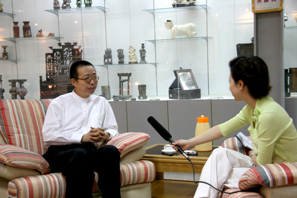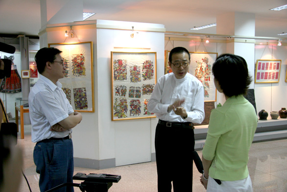 院长在我校博物馆,就通过大学教育改变民间艺术面临着“人亡艺绝”的困境的可能性、 艺考热、学生就业以及学校办学理念等问题接受了山东电视台第九频道栏目专访。
