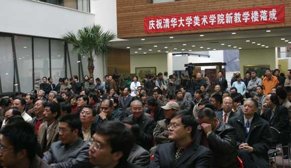 典礼由清华大学美术学院党委书记王进展主持。清华大学美术学院基建委员会领导、清华大学美术学院工程设计单位公司总裁Mr. Henry Mann先生、清华大学美术学院工程施工单位领导叶大伟等为典礼致词。他们表示:清华大学美术学院是师资力量雄厚,专业配置齐全、理论研究与社会实践于一体的综合性、多学科、高层次、享誉国内外的高等艺术设计院校。在清华大学美术学院建院49周年这个喜庆的日子里,举行美院新教学楼的落成典礼,是学院组建、成立以来的又一盛事。随着美院大楼的顺利交接使用,作为艺术院校的清华大学美术学院将与清华大学共同成长。大楼的成功启用基于学院领导的高瞻远瞩,更是相关单位全力配合、辛苦工作的结果。他们感谢为大楼建设倾注全部心血、兢兢业业工作的所有参建者,祝愿清华大学美术学院在新教学楼的启用下创造更加美好的明天。