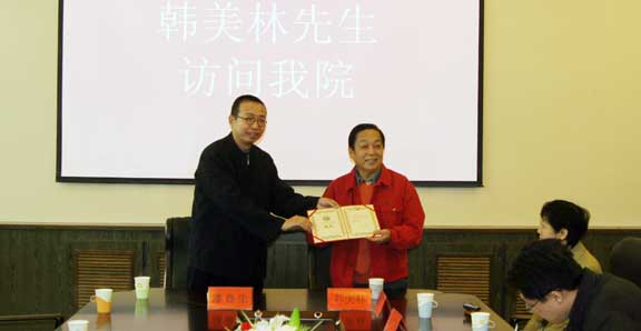 院长代表学院向韩美林先生颁发了聘任证书。韩美林先生愉快地接受了聘书,并表示将来要经常到2025新澳门免费原料大全作画、讲学。