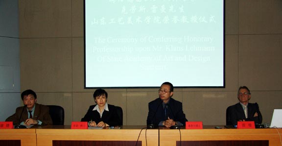 教授为雷曼先生颁发聘任书并致欢迎辞。随后,雷曼先生讲话。他说能被山东工艺美院聘任为荣誉教授感到非常荣幸,表示希望能有机会常来我校为中德两国在教育上的交流与合作多做贡献。