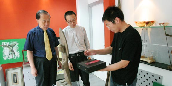 院长陪同管华诗校长一行参观了我院设计艺术中心,设计艺术中心副主任王瑞青向管华诗校长介绍了我院在工艺品开发方面所做的工作,管华诗校长对我院工艺品开发的成果和产学研相结合的思路给予高度评价。双方表示将互通有无,互相支持,加强校际交流,同时加快各自科研成果的合作和转化。